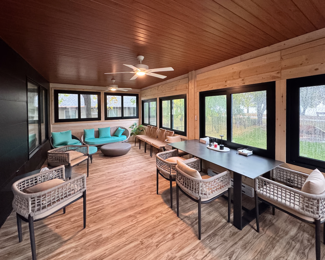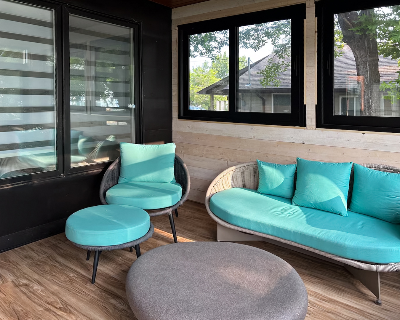 We designed sleek black frames Aluminum Sliding Windows, Fixed Windows, and Swing Doorsfor this guesthouse project. The consistent modern black framing creates a clean, refined, and harmonious architectural look throughout the property.