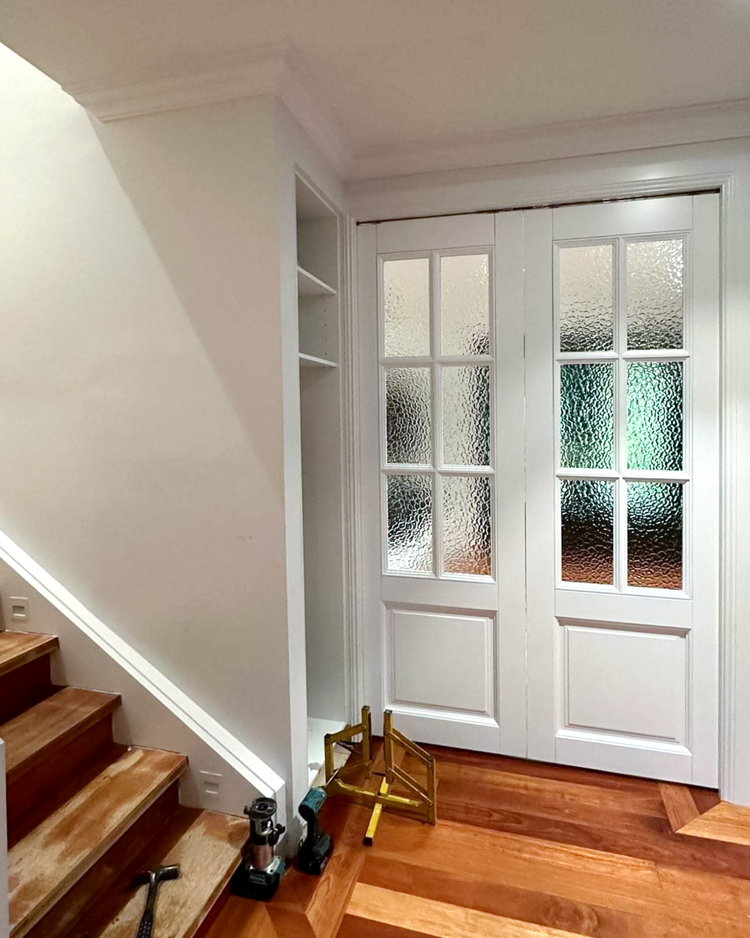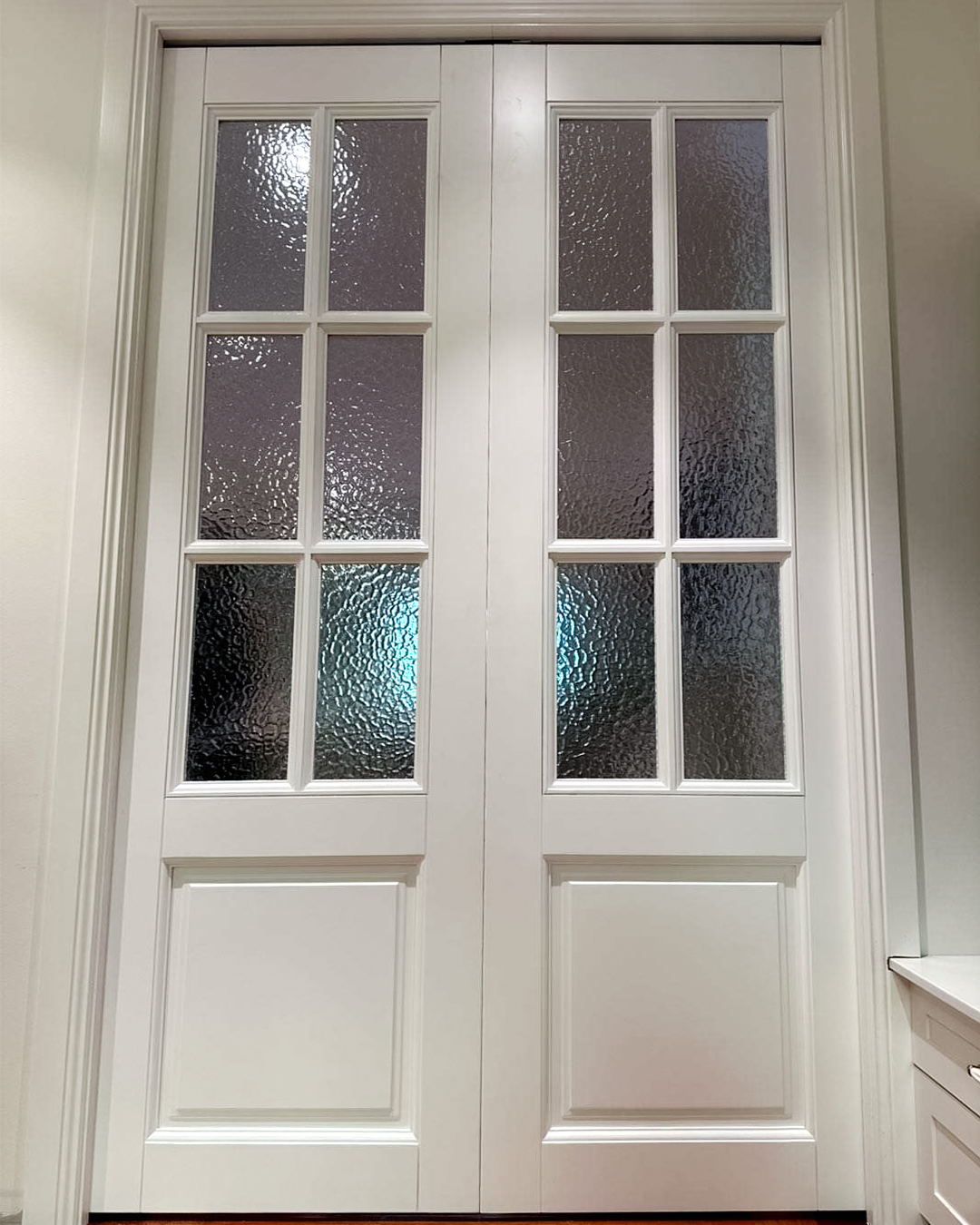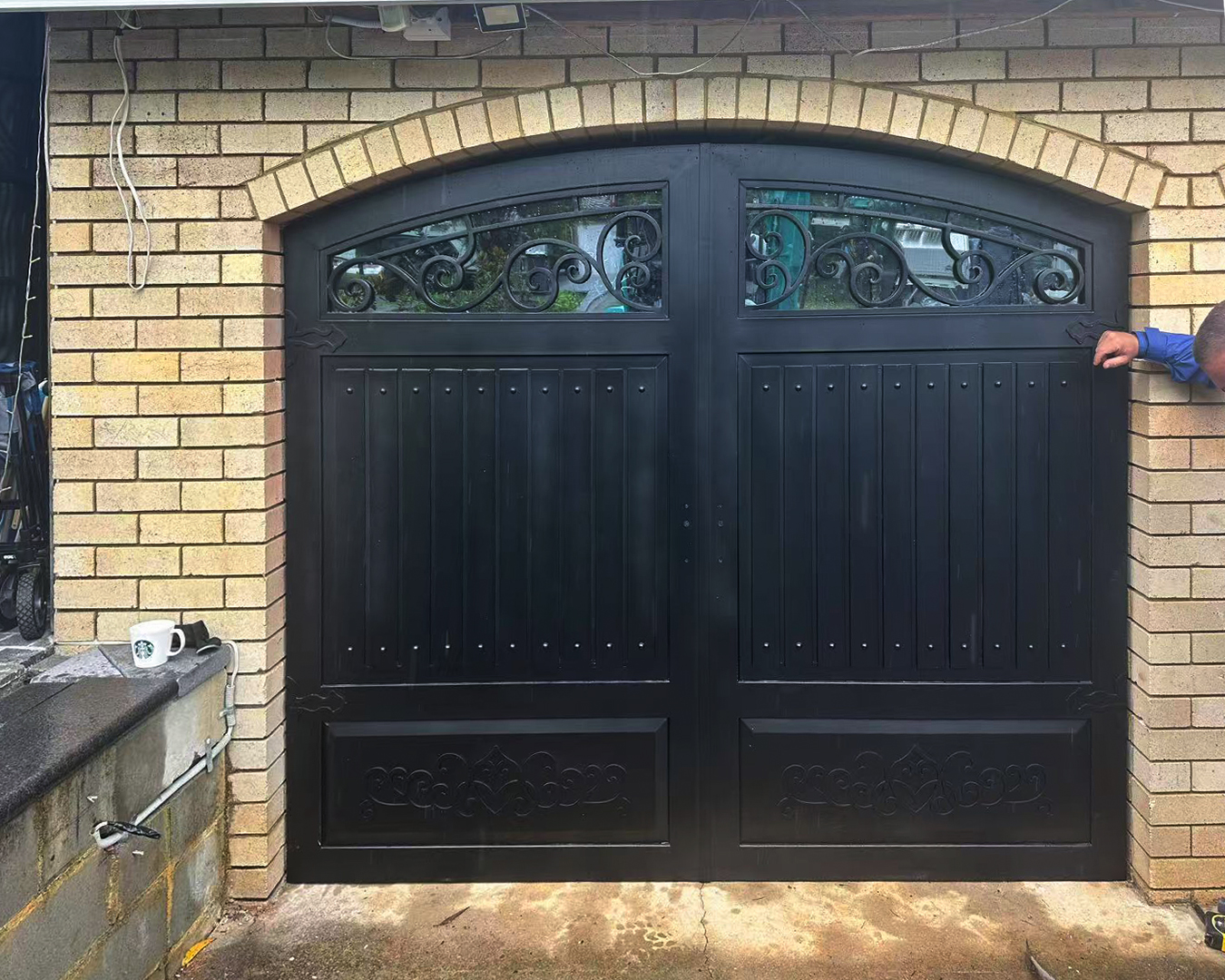 We designed refined white Wooden Swing Doorsand Pocket Doorswith delicate craft grids and rain glass for this residence. The combination creates an elegant interplay of light and texture. We also crafted a decorative wrought iron gate for the garage, enhancing the overall architectural character with classic artistic detail.