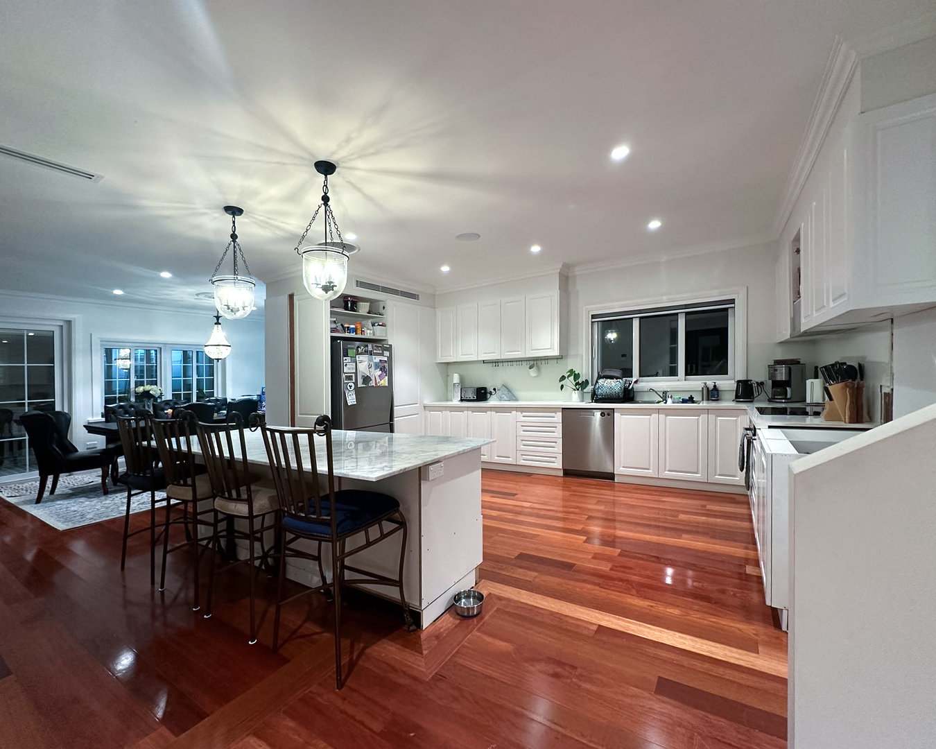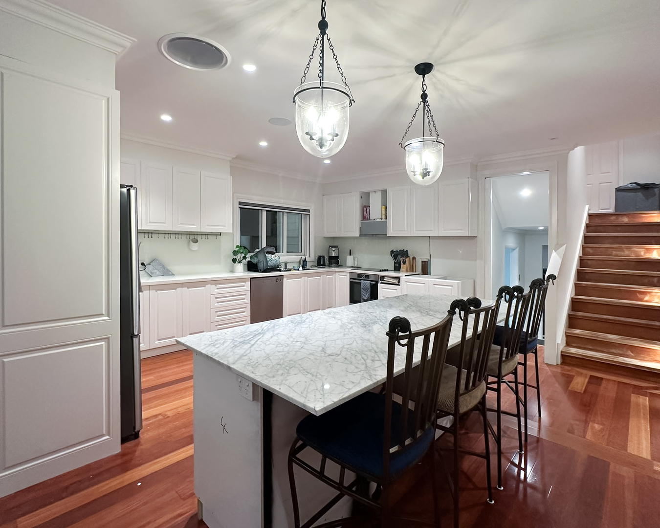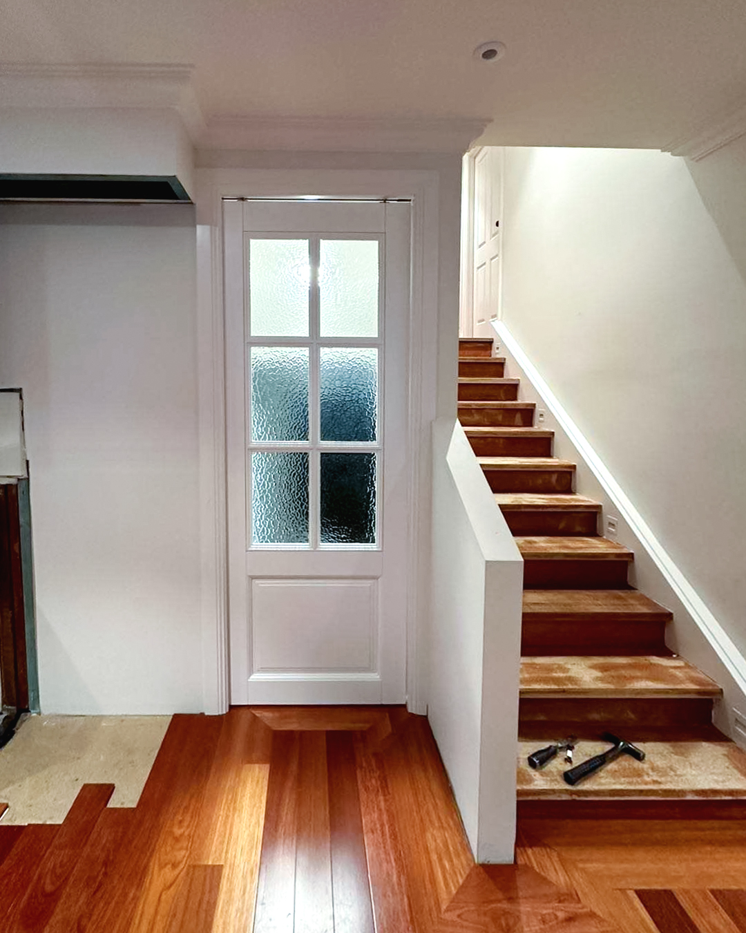 We designed refined white Wooden Swing Doorsand Pocket Doorswith delicate craft grids and rain glass for this residence. The combination creates an elegant interplay of light and texture. We also crafted a decorative wrought iron gate for the garage, enhancing the overall architectural character with classic artistic detail.