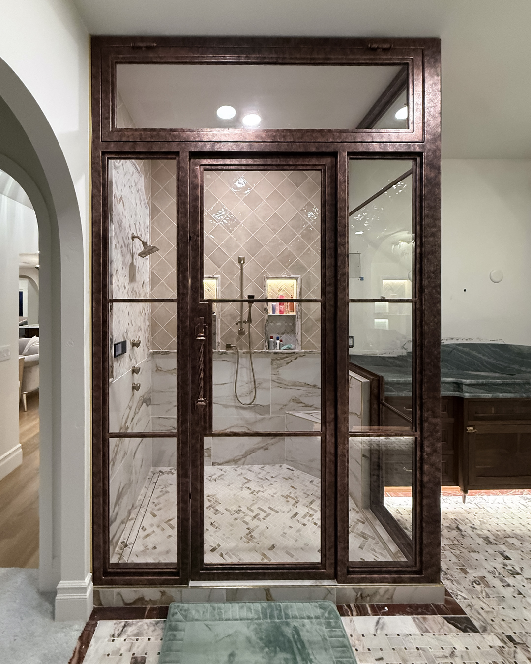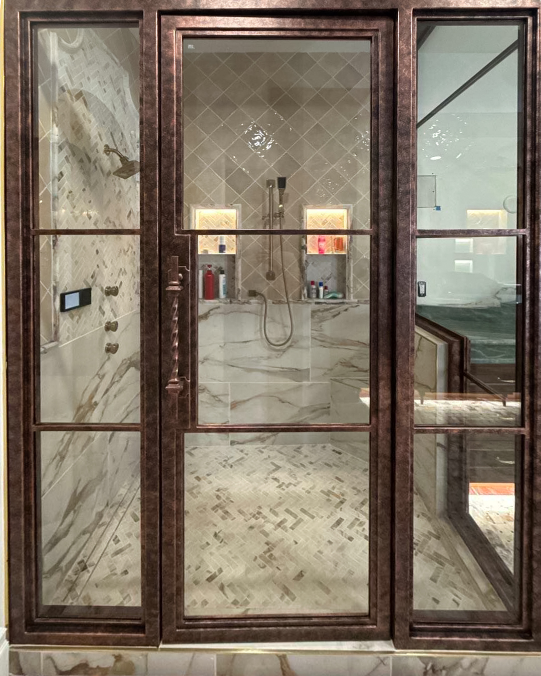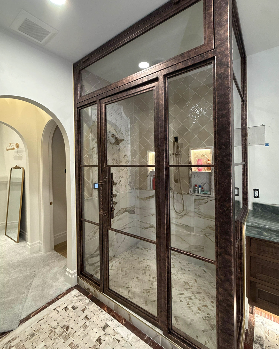 We designed Interior Wood Arched Doorwith a distinctive raised pyramid motif at the base, paired with matching Arched Pocket Door. The bathroom features a custom iron-framed shower enclosure in a rich fixed-tone finish and a smooth sliding bathtub door, creating a cohesive and refined interior experience.