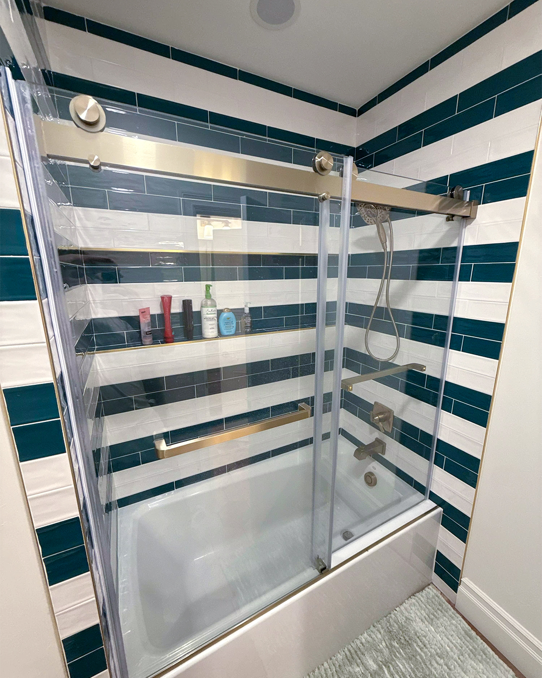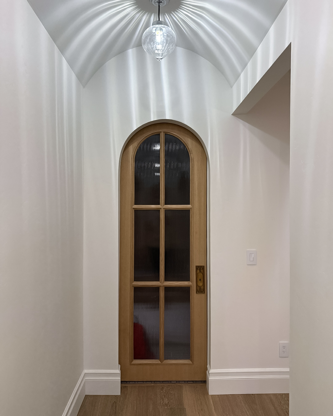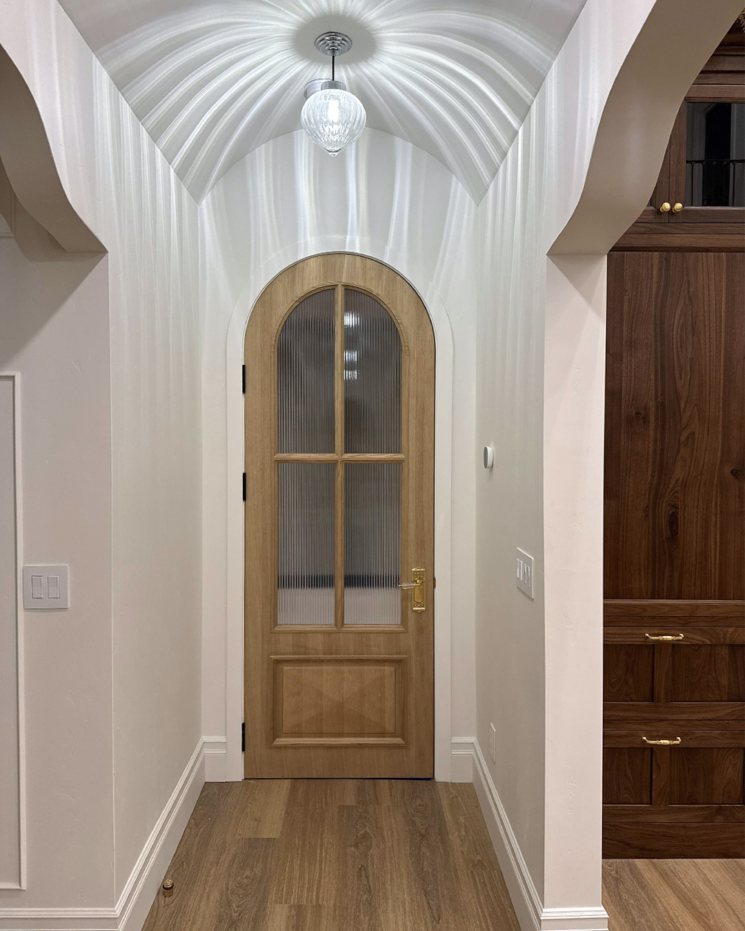 We designed Interior Wood Arched Doorwith a distinctive raised pyramid motif at the base, paired with matching Arched Pocket Door. The bathroom features a custom iron-framed shower enclosure in a rich fixed-tone finish and a smooth sliding bathtub door, creating a cohesive and refined interior experience.