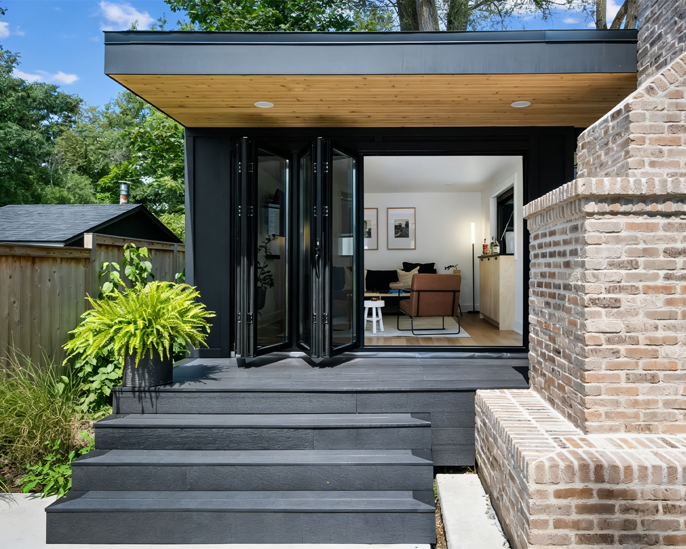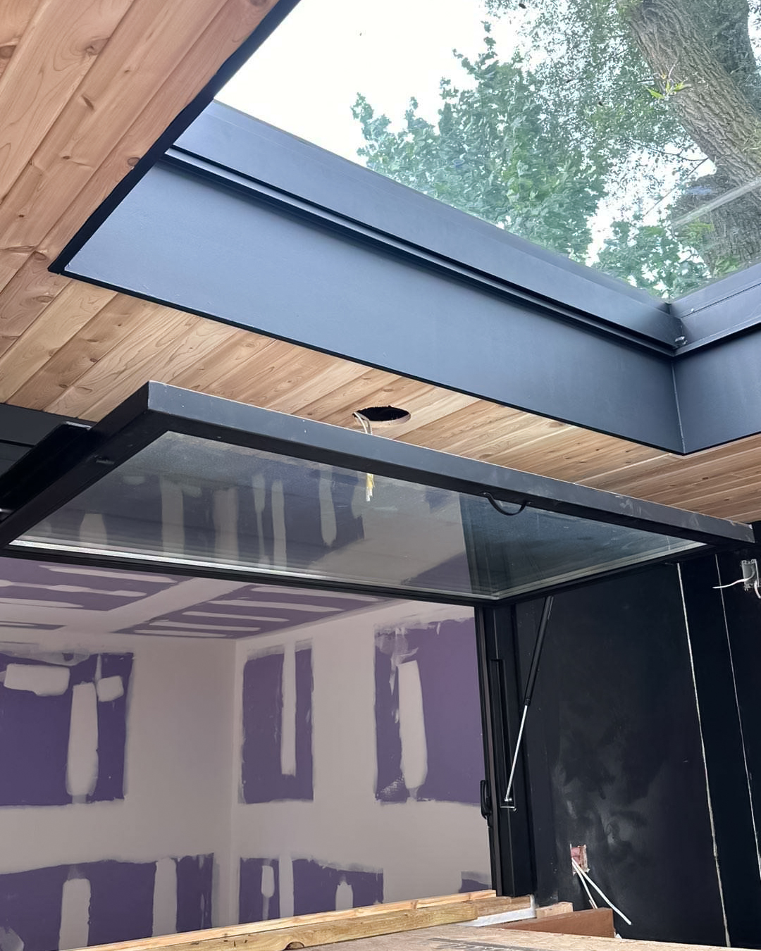 We designed Aluminum Bifold Door, steel gas strut window, and motorized Sliding Roof Skylightfor this beautiful cabin. The combination creates wide, effortless openings and generous natural light, perfectly blending modern functionality with the warm character of the wooden cabin.